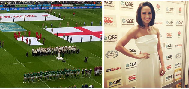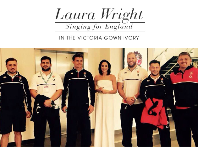 Mezzo-Soprano Laura Wright, the Rugby Football Unions Official Anthem Singer, looked elegant and sophisticated singing for England wearing the Alie Street Victoria Gown. She led the Twickenham Stadium into a chorus of the Swing Low Sweet Chariot, Jerusalem, and the National Anthem ahead of the England vs Ireland Rugby World Cup warm up match on Saturday.