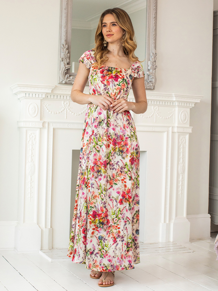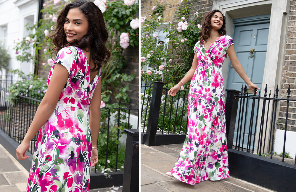 Das für zierliche Figuren entworfene Maxikleid Sophia besticht durch leuchtend pinkfarbene Blumenmuster und eine maßgeschneiderte Passform, die für Eleganz sorgt, ohne Ihre Figur zu erdrücken.