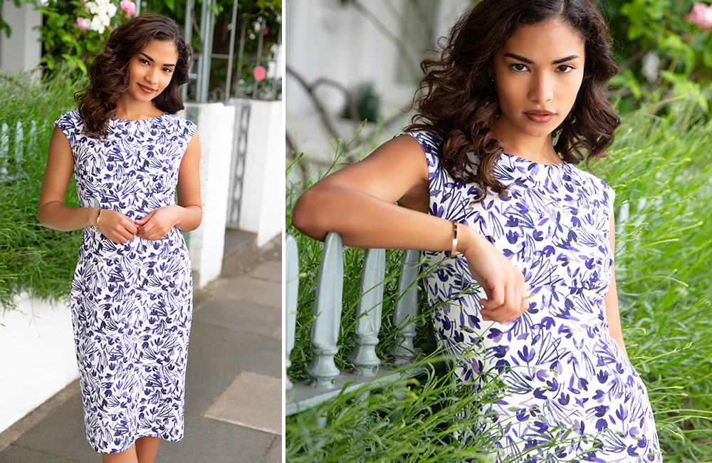 Das Etuikleid Pippa bietet eine schlanke Silhouette in einem frischen tintenblauen und weißen Druck, perfekt für Tages- und Abendausflüge.