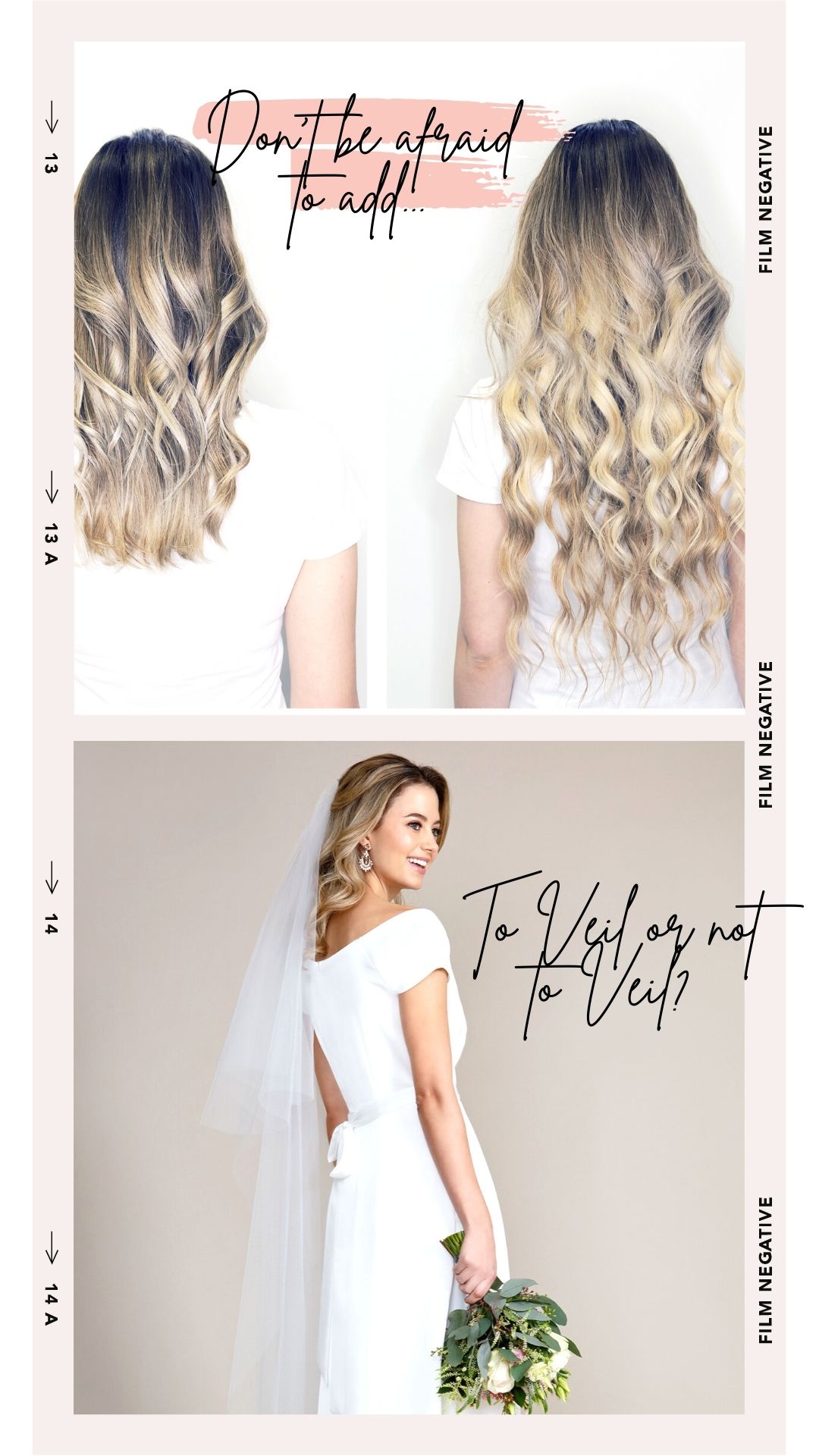 Si vous le pouvez, prenez votre voile aussi bien pour les essayages de votre robe que pour les essayages coiffure et, si besoin, n'hésitez pas à imaginer vos autres options : un chapeau ou un bijou de tête peuvent très bien remplacer un voile, en particulier une fois la cérémonie terminée.