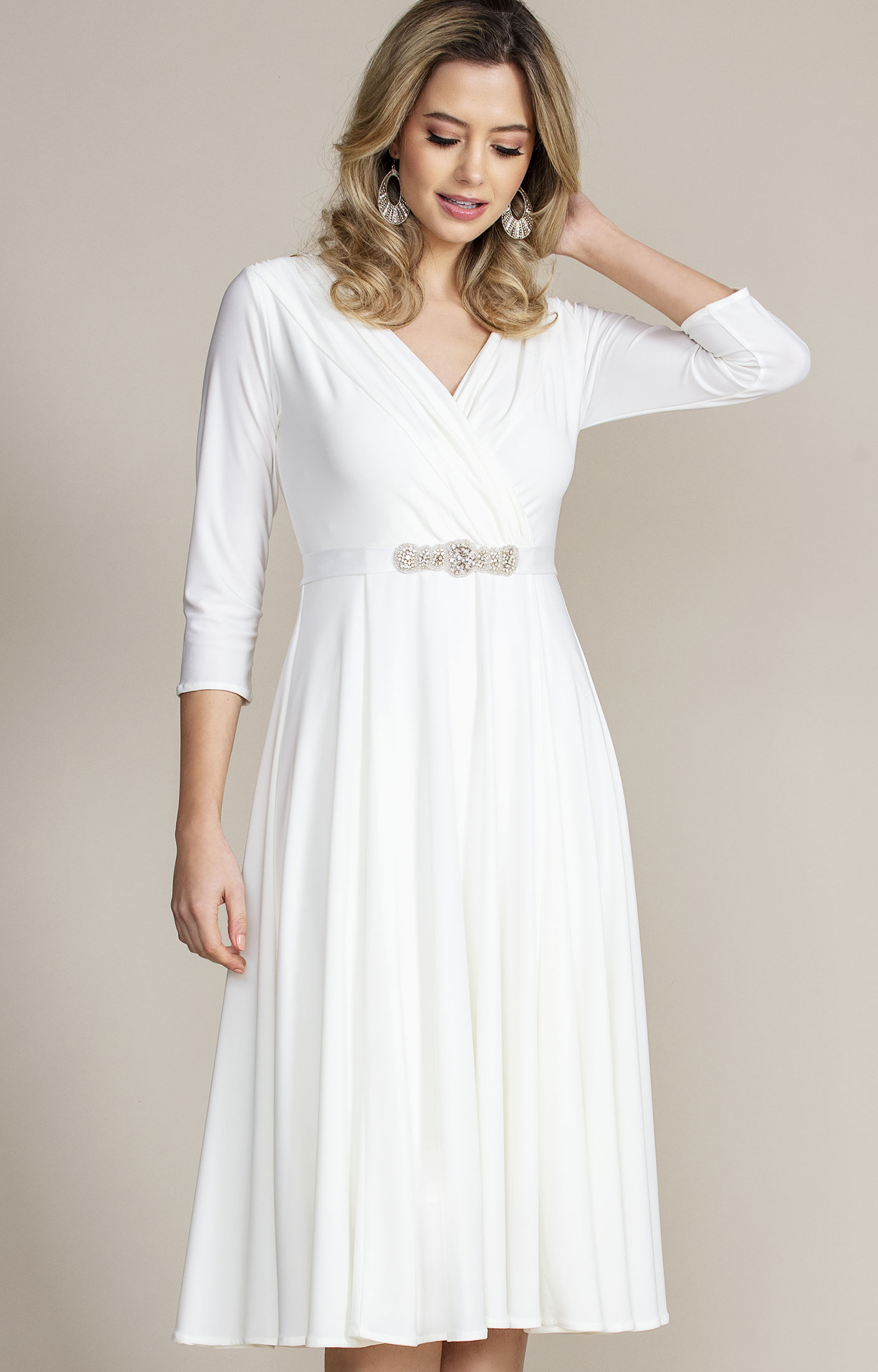 Want to take a leaf out of style icon Marilyn Monroe's book? Look no further than the Annie dress in Ivory. Created for a flattering silhouette, this stunning fit-and-flare design in dreamy ivory features a gathered crossover-neckline and 3/4 length sleeves. Say 'I Do' at your intimate wedding or keep it casual with ankle boots and your favourite belt. Either way this bestselling design is a firm favourite for instant slimming style, comfort and wearability. Made in a sheer smooth jersey with a hint of sheen that overlays our favourite soft viscose jersey lining.
