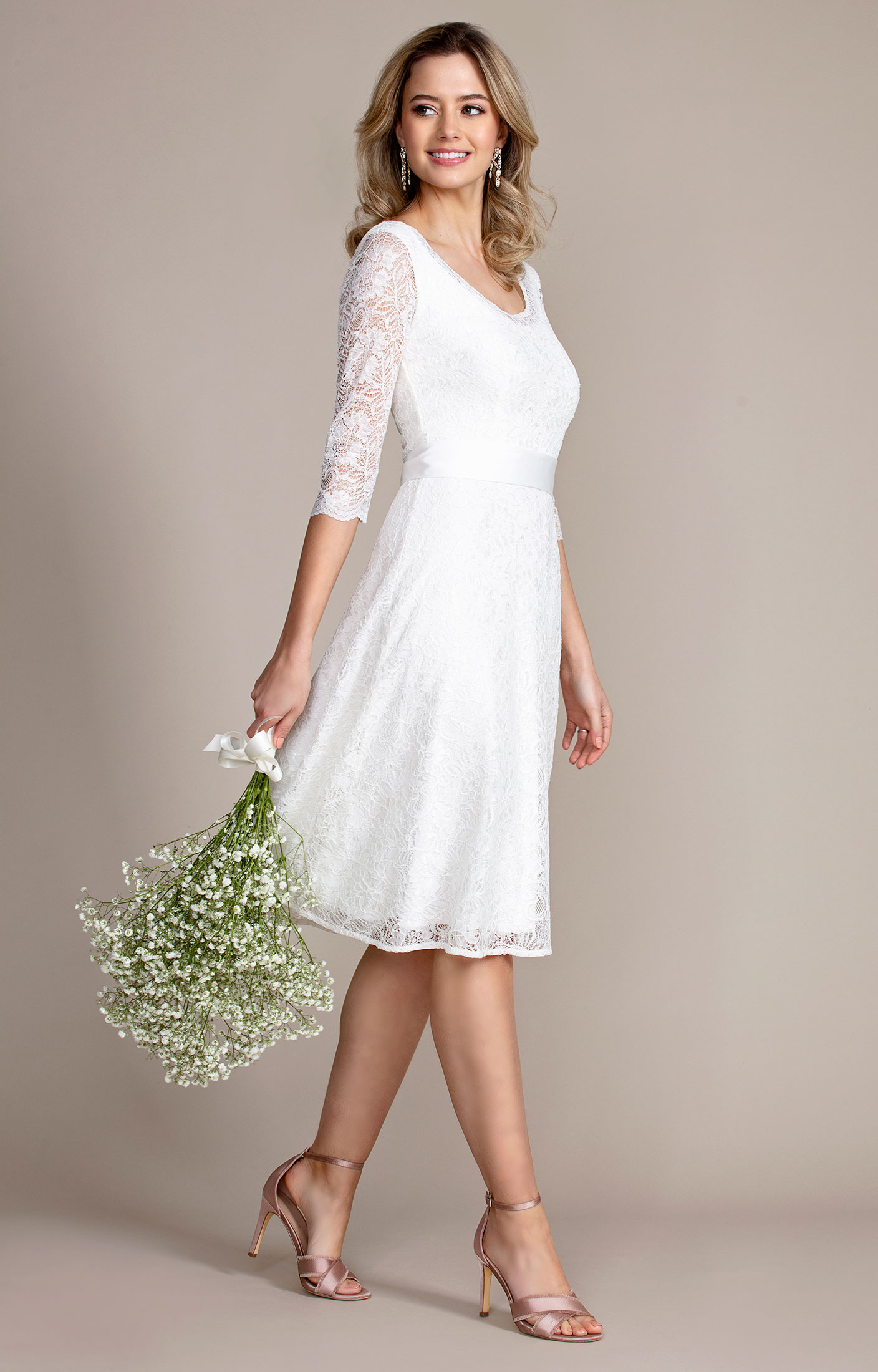 A subtle scoop neckline and full skirt give this Alie Street wedding dress a lovely 1950s feel. Cut just above the knee in premium corded Ivory lace with subtle stretch for comfort and the perfect fit. The soft jersey interlining has a subtle shimmer under swathes of feminine, floral lace. We've added a zip at the waist to create a super shape that's flattering and easy to wear. The ¾ sheer lace sleeves have a pretty scalloped edge, the perfect finishing touch to the perfect wedding dress. Why not be different and add a pop of colour in your shoes and a matching red lip for the full 1950's feel?