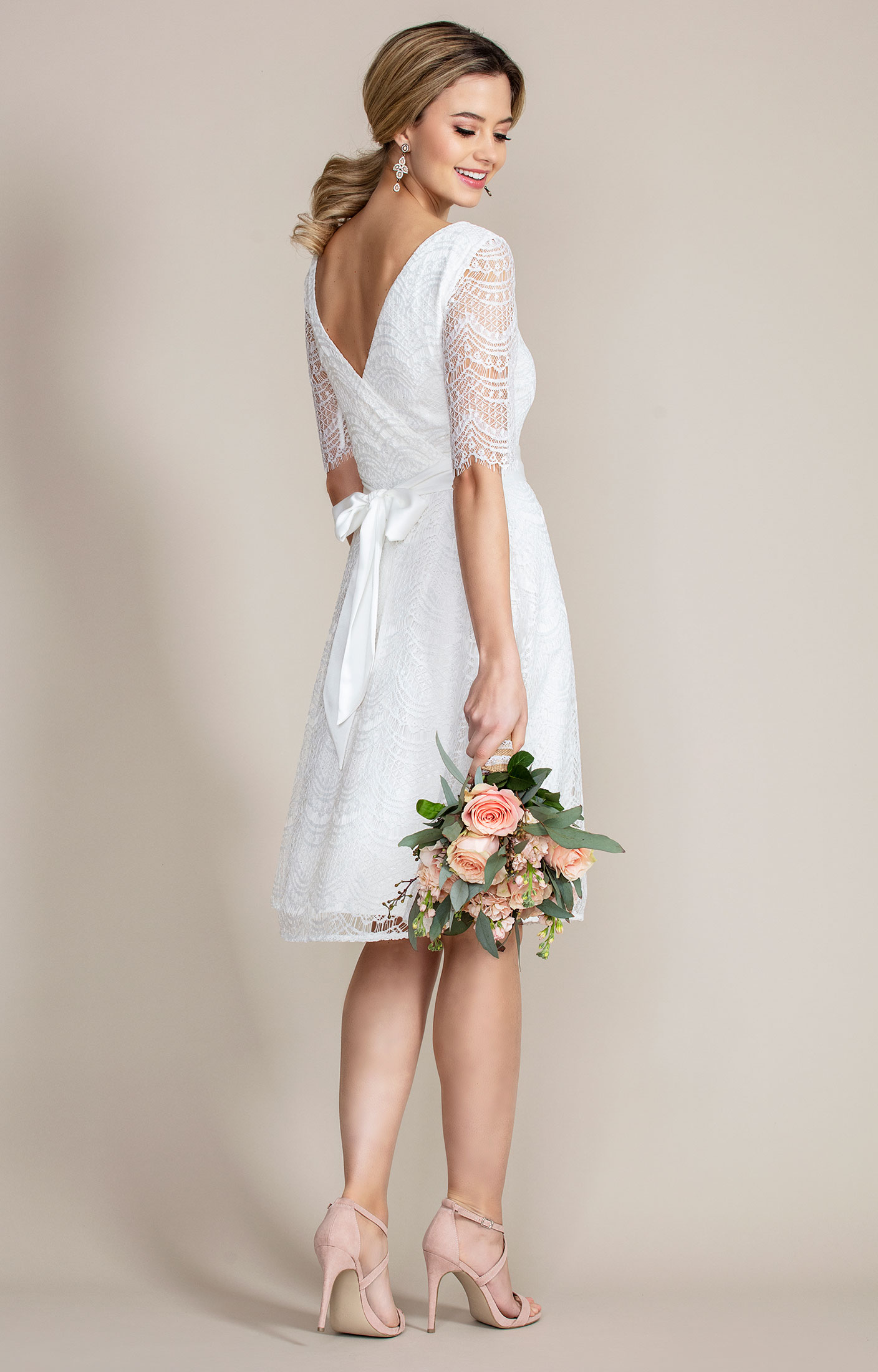 Vintage-meets-modern with pretty eyelash lace and a 50s style fit and flare knee-length skirt, the Evie dress will take you from day ceremony to evening reception with ease.